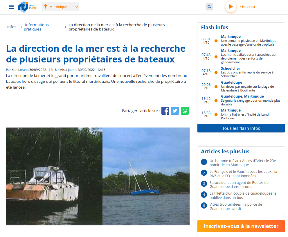 La direction de la mer et le grand port maritime travaillent de concert à l’enlèvement des nombreux bateaux hors d’usage qui polluent le littoral martiniquais. Une nouvelle recherche de propriétaire a été lancée