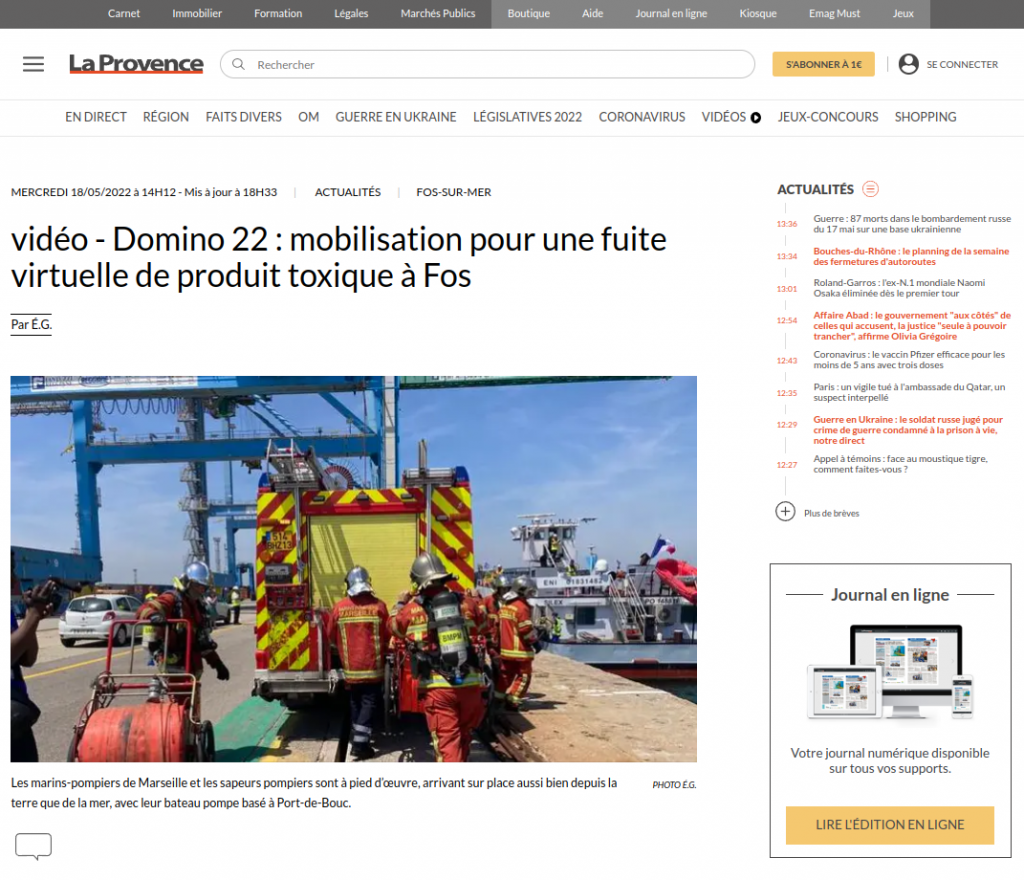 Lors de l’exercice géant de sécurité civile « domino 22 », après des manœuvres en mer, c’est une fuite de produit toxique qui a été simulée sur les quais des bassins ouest, en darse 2 du Grand port maritime de Marseille (GPMM), à Fos.