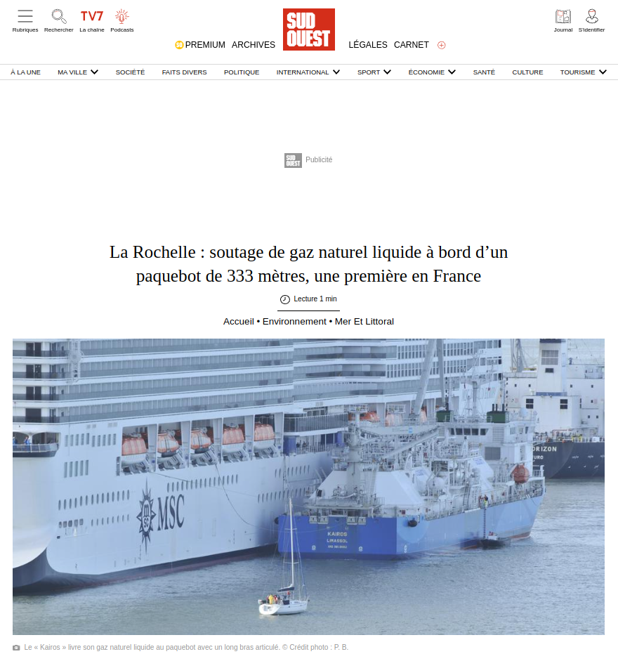 Le soutage vers le paquebot « MSC World Europa » du gaz naturel liquide stocké à bord du « Kairos » a débuté ce samedi matin 10 septembre, au Grand Port maritime de La Rochelle. Une première en France