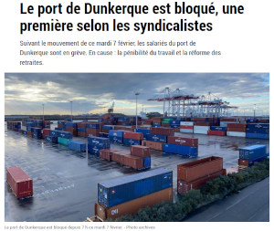 Sources: https://www.nordlittoral.fr/165167/article/2023-02-07/le-port-de-dunkerque-est-bloque-une-premiere-selon-les-syndicalistes?referer=%2Farchives%2Frecherche%3Fdatefilter%3Dlastyear%26sort%3Ddate%2Bdesc%26word%3Ddunkerque%2Bport