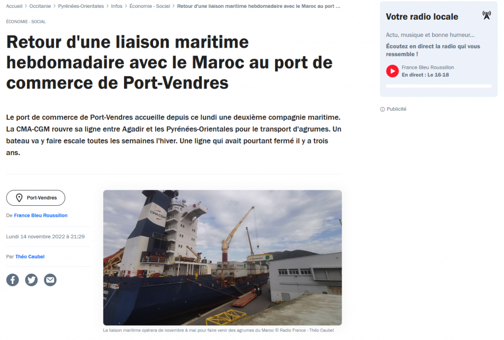Sources: https://www.francebleu.fr/infos/economie-social/port-vendres-retour-d-une-liaison-maritime-hebdomadaire-avec-le-maroc-1668456448