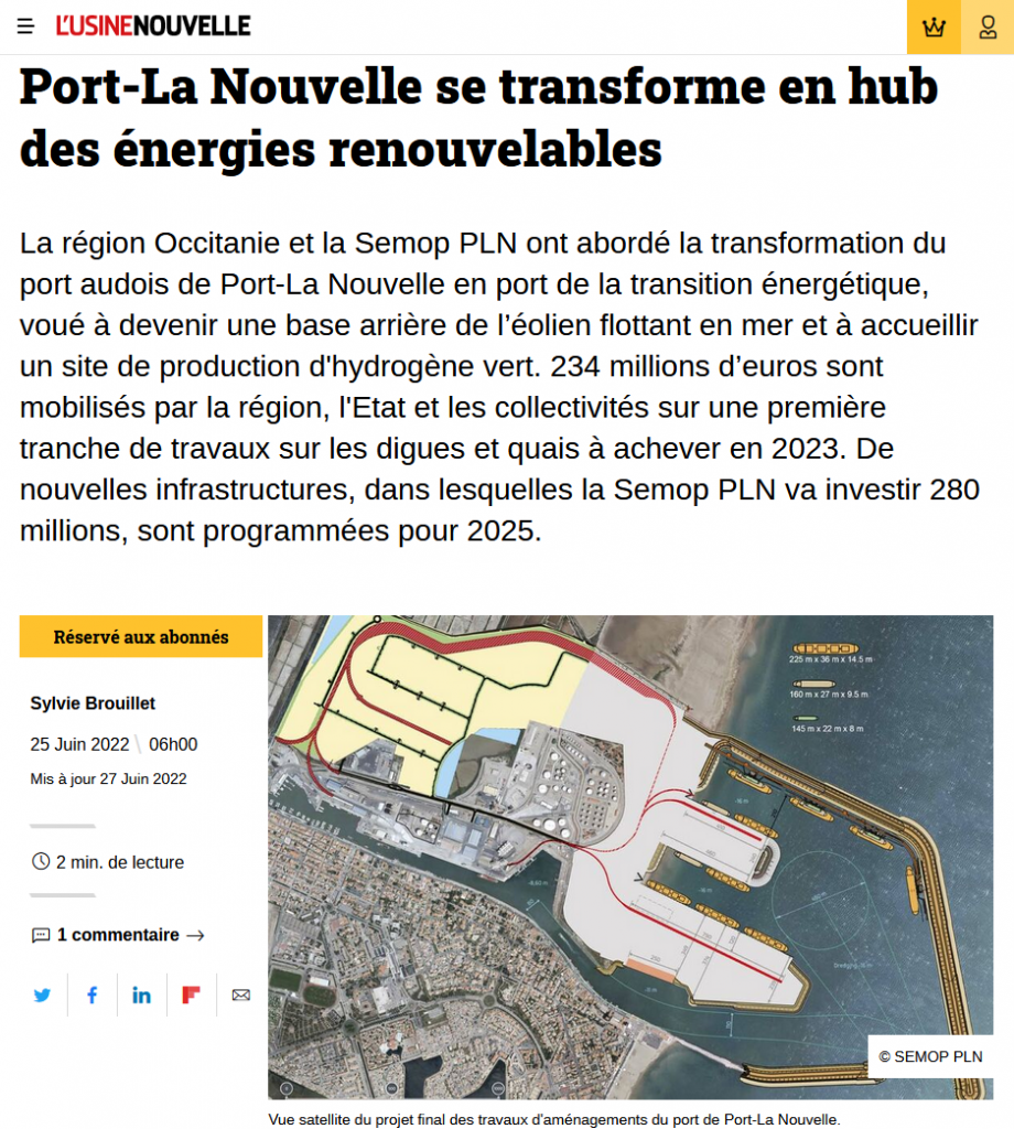 La région Occitanie et la Semop PLN ont abordé la transformation du port audois de Port-La- Nouvelle en port de la transition énergétique, voué à devenir une base arrière de l’éolien flottant en mer et à accueillir un site de production d’hydrogène vert. 234 millions d’euros sont mobilisés par la région, l’Etat et les collectivités sur une première tranche de travaux sur les digues et quais à achever en 2023. De nouvelles infrastructures, dans lesquelles la Semop PLN va investir 280 millions, sont programmées pour 2025